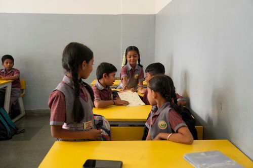 Classes begin promptly, with teachers leading structured lessons in science, mathematics, languages, and social studies. The afternoon sessions balance academics with enrichment—art, music, yoga, physical education, and moral science.